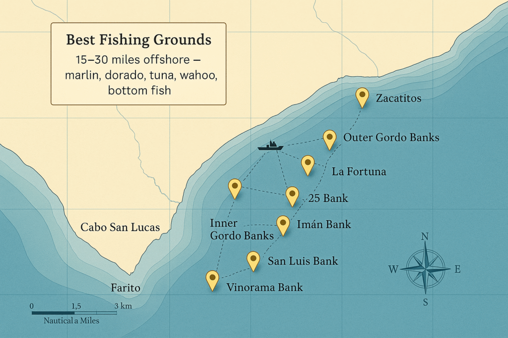 Our charters take you to top fishing spots in Los Cabos, including Inner and Outer Gordo Banks, Zacatitos, Shipwrecks, La Fortuna, 25 Bank, Imán Bank, San Luis Bank, Vinorama Bank, and Farito. These prime locations, just 15-30 miles offshore, are known for marlin, dorado, tuna, wahoo and bottom fish. There’s no shortage of spots to test your skills!